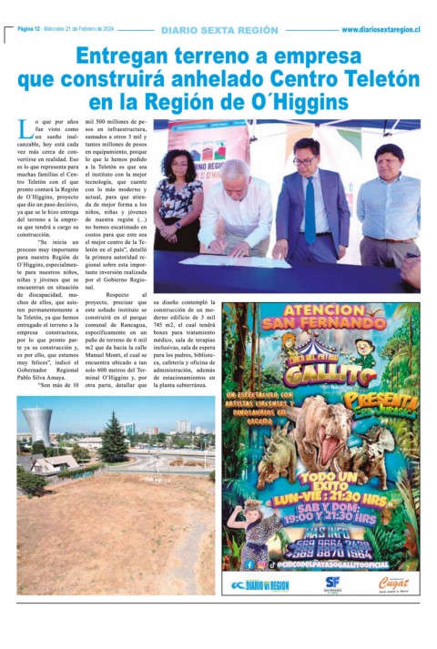 Página 12 - Miércoles 21 de Febrero de 2024 www.diariosextaregion.cl Página 12 - Miércoles 21 de Febrero de 2024 Entregan terreno a empresa que construirá anhelado Centro Teletón en la Región de O´Higgins