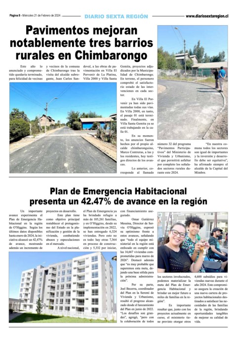 Página 8 - Miércoles 21 de Febrero de 2024 Pavimentos mejoran notablemente tres barrios rurales en Chimbarongo Plan de Emergencia Habitacional presenta un 42.47% de avance en la región