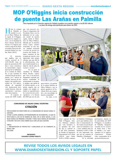 Página 6 - Viernes 23 de Febrero de 2024 DIARIO SEXTA REGION www.diariosextaregion.cl
