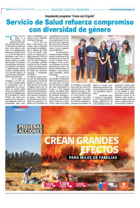 Página 12 - Martes 27 de Febrero de 2024 www.diariosextaregion.cl Página 12 - Martes 27 de Febrero de 2024 Impulsando programa “Crece con Orgullo” Servicio de Salud refuerza compromiso con diversidad de género “