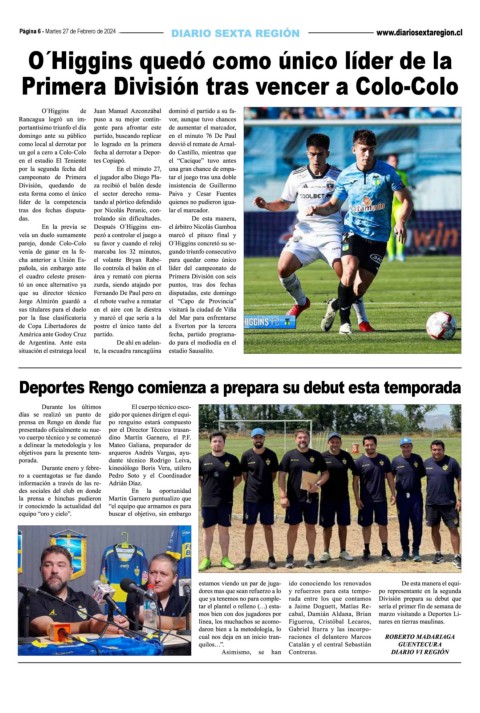 Página 6 - Martes 27 de Febrero de 2024 O´Higgins quedó como único líder de la Primera División tras vencer a Colo-Colo Deportes Rengo comienza a prepara su debut esta temporada