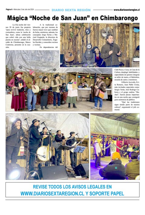 Página 6 - Miércoles 3 de Julio de 2024 Mágica “Noche de San Juan” en Chimbarongo REVISE TODOS LOS AVISOS LEGALES EN WWW.DIARIOSEXTAREGION.CL Y SOPORTE PAPEL