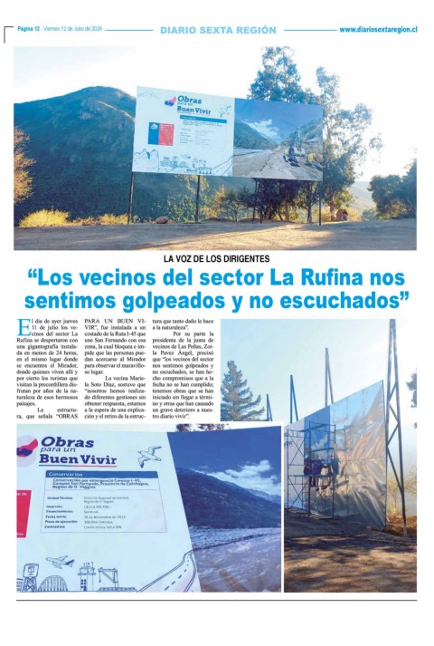 Página 12 - Viernes 12 de Julio de 2024 www.diariosextaregion.cl Página 12 - Viernes 12 de Julio de 2024 LA VOZ DE LOS DIRIGENTES “Los vecinos del sector La Rufina nos sentimos golpeados y no escuchados”