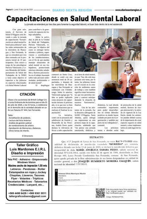 Página 6 - Lunes 15 de Julio de 2024 Capacitaciones en Salud Mental Laboral La jornada se extenderá por tres días para fomentar la seguridad laboral y el buen trato dentro de la red asistencial. 12-15-17-240711301-02-03