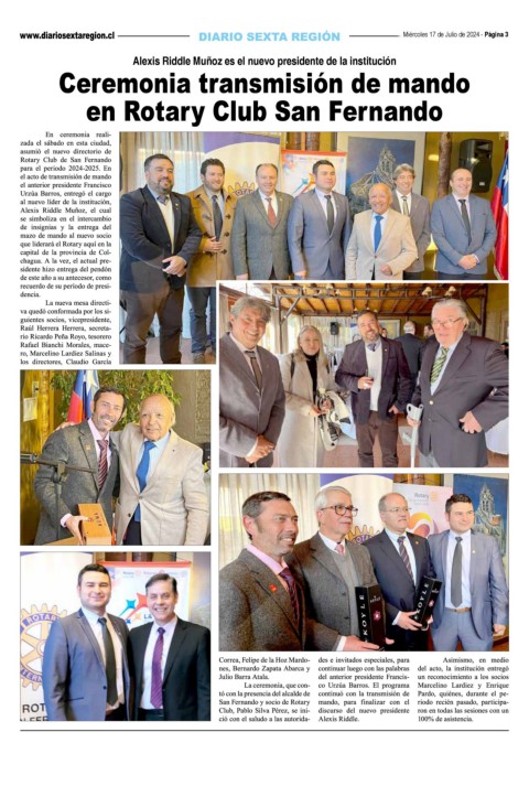 Miércoles 17 de Julio de 2024 - Página 3 Alexis Riddle Muñoz es el nuevo presidente de la institución Ceremonia transmisión de mando en Rotary Club San Fernando