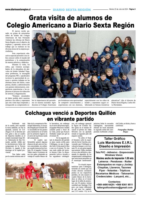 Martes 23 de Julio de 2024 - Página 3 Grata visita de alumnos de Colegio Americano a Diario Sexta Región Colchagua venció a Deportes Quillón en vibrante partido