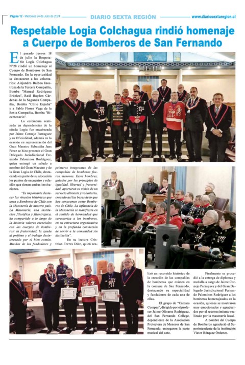 Página 12 - Miércoles 24 de Julio de 2024 www.diariosextaregion.cl Página 12 - Miércoles 24 de Julio de 2024 Respetable Logia Colchagua rindió homenaje a Cuerpo de Bomberos de San Fernando