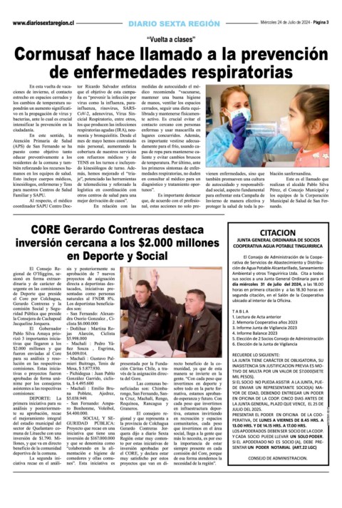 Miércoles 24 de Julio de 2024 - Página 3 “Vuelta a clases” Cormusaf hace llamado a la prevención de enfermedades respiratorias CORE Gerardo Contreras destaca inversión cercana a los $2.000 millones en Deporte y Social 240723501-02-03