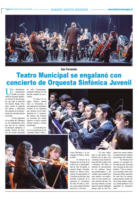 Página 12 - Martes 30 de Julio de 2024 www.diariosextaregion.cl Página 12 - Martes 30 de Julio de 2024 San Fernando Teatro Municipal se engalanó con concierto de Orquesta Sinfónica Juvenil