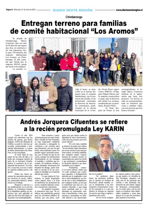 Página 8 - Miércoles 31 de Julio de 2024 Chimbarongo Entregan terreno para familias de comité habitacional “Los Aromos” Andrés Jorquera Cifuentes se refiere a la recién promulgada Ley KARIN