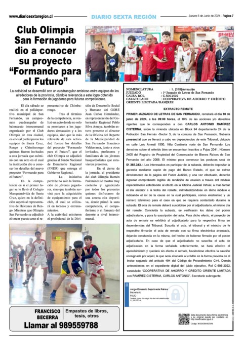 PRIMER JUZGADO DE LETRAS DE SAN FERNANDO, rematará el día 18 de