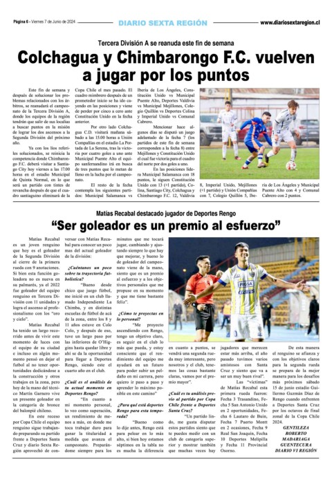 Página 6 - Viernes 7 de Junio de 2024 Tercera División A se reanuda este fin de semana Colchagua y Chimbarongo F.C. vuelven a jugar por los puntos Matías Recabal destacado jugador de Deportes Rengo “Ser goleador es un premio al esfuerzo”