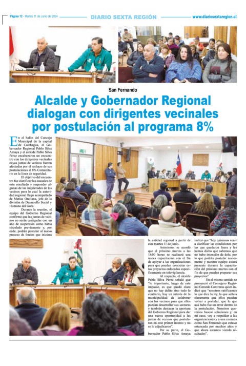 Página 12 - Martes 11 de Junio de 2024 www.diariosextaregion.cl Página 12 - Martes 11 de Junio de 2024 San Fernando Alcalde y Gobernador Regional dialogan con dirigentes vecinales por postulación al programa 8%