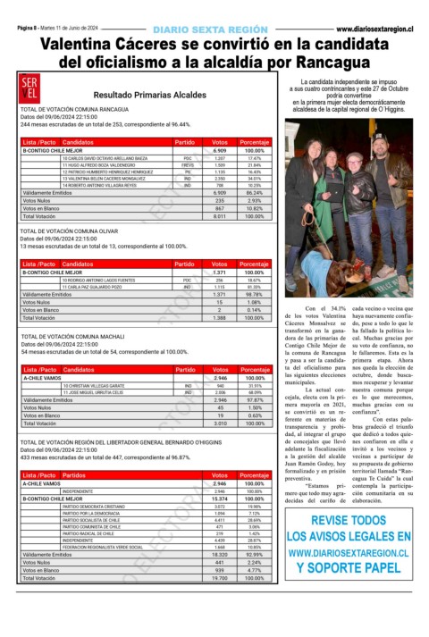 TOTAL DE VOTACIÓN COMUNA RANCAGUA SANTIAGO, 10/06/2024 11:04:12 en la primera mujer electa democráticamente