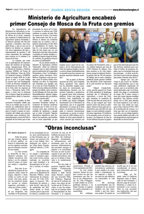 Página 4 - Jueves 13 de Junio de 2024 Ministerio de Agricultura encabezó primer Consejo de Mosca de la Fruta con gremios "Obras inconclusas"