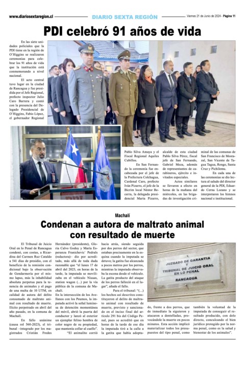 Viernes 21 de Junio de 2024 - Página 11 PDI celebró 91 años de vida Machalí Condenan a autora de maltrato animal con resultado de muerte