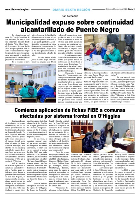 Miércoles 26 de Junio de 2024 - Página 3 San Fernando Municipalidad expuso sobre continuidad alcantarillado de Puente Negro Comienza aplicación de fichas FIBE a comunas afectadas por sistema frontal en O’Higgins