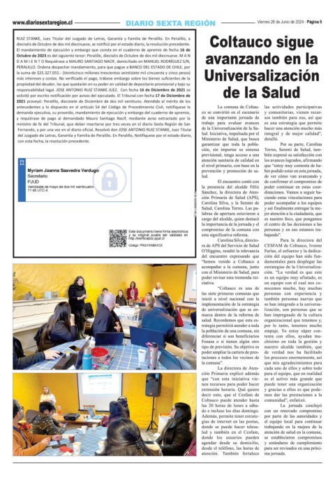 RUIZ STANKE, Juez Titular del Juzgado de Letras, Garantía y Familia de Peralillo. En Peralillo, a Coltauco sigue