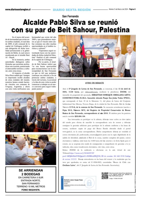 Ante el 2 Juzgado de Letras de San Fernando, se rematar , el d a 15 de abril de