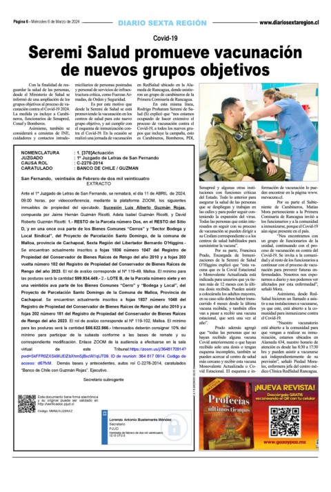 Ante el 1º Juzgado de Letras de San Fernando, se rematará, el día 11 de ABRIL de 2024, : 1. [378]Actuación