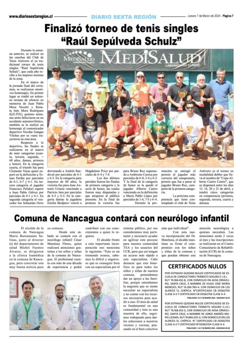 Jueves 7 de Marzo de 2024 - Página 7 Finalizó torneo de tenis singles “Raúl Sepúlveda Schulz” Comuna de Nancagua contará con neurólogo infantil CERTIFICADOS NULOS
