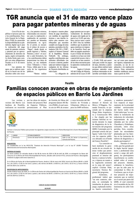 Desde el 08 de marzo de 2024, en la Oficina de Partes de la Municipalidad de Peumo en horario de Oficina (08:45 a 14:00