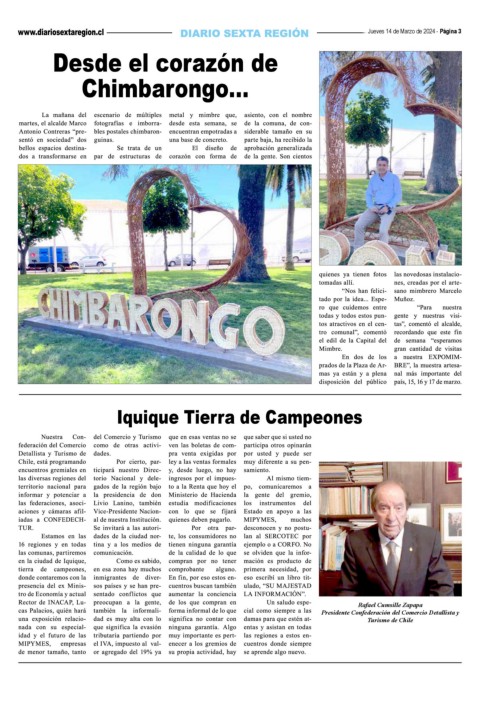 Jueves 14 de Marzo de 2024 - Página 3 Desde el corazón de Chimbarongo… Iquique Tierra de Campeones Rafael Cumsille Zapapa Presidente Confederación del Comercio Detallista y Turismo de Chile