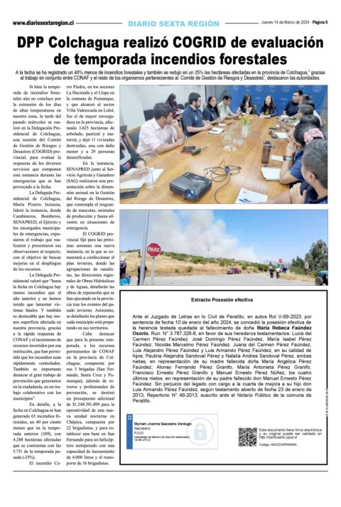 A la fecha se ha registrado un 40% menos de incendios forestales y también se redujo en un 25% las hectáreas afectadas en la provincia de Colchagua,” gracias