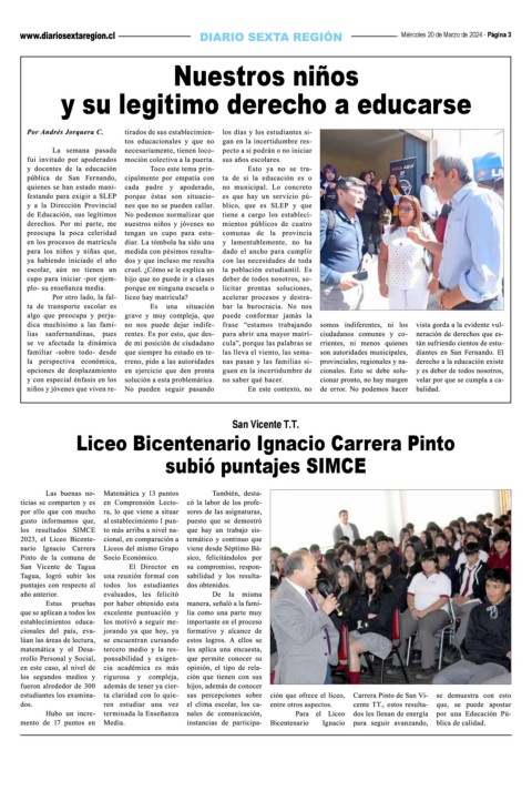 Miércoles 20 de Marzo de 2024 - Página 3 Nuestros niños y su legitimo derecho a educarse San Vicente T.T. Liceo Bicentenario Ignacio Carrera Pinto subió puntajes SIMCE