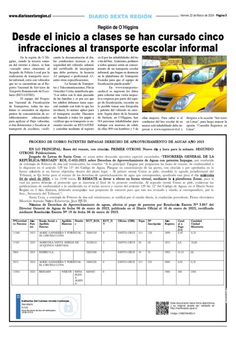 publicaciones de conformidad a lo establecido en el inciso tercero y cuarto del art culo 129 bis 12 del C digo de Aguas, en el Diario Sexta
