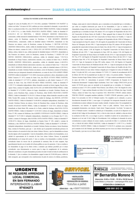 forma exclusiva a la sucesión de don Luis Arturo Ordenes Álvarez, y que los demandados no tienen San Fernando, y por una vez en el diario oficial.
