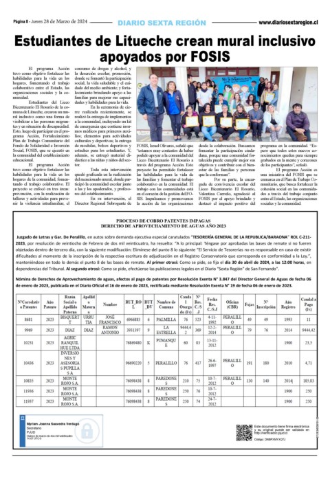 dependencias del Tribunal. Al segundo otrosí: Como se pide, efectúense las publicaciones legales en el Diario “Sexta Región” de San Fernando”.