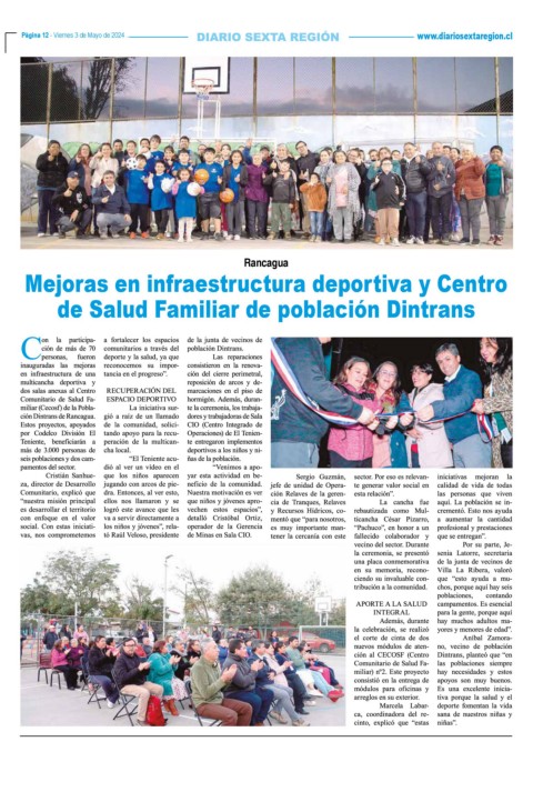 Página 12 - Viernes 3 de Mayo de 2024 www.diariosextaregion.cl Página 12 - Viernes 3 de Mayo de 2024 Rancagua Mejoras en infraestructura deportiva y Centro de Salud Familiar de población Dintrans