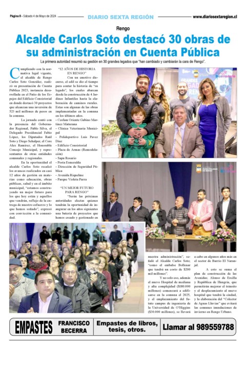 La primera autoridad resumió su gestión en 30 grandes legados que “han cambiado y cambiarán la cara de Rengo”.