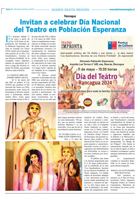 Página 12 - Miércoles 8 de Mayo de 2024 www.diariosextaregion.cl Página 12 - Miércoles 8 de Mayo de 2024 Rancagua Invitan a celebrar Día Nacional del Teatro en Población Esperanza