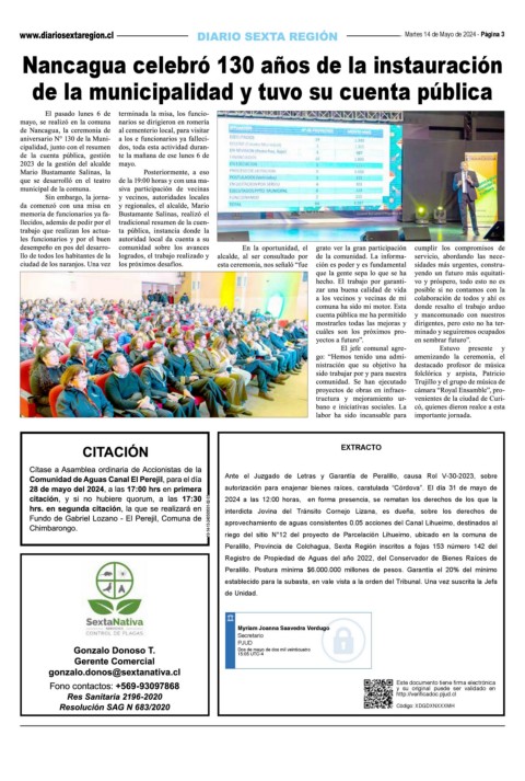 Peralillo, Provincia de Colchagua, Sexta Región inscritos a fojas 153 número 142 del