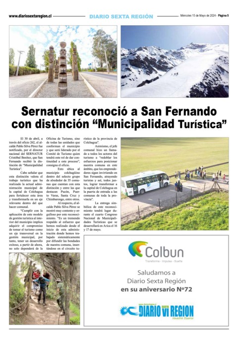 Miércoles 15 de Mayo de 2024 - Página 5 Sernatur reconoció a San Fernando con distinción “Municipalidad Turística” Transforma - Impulsa - Sueña Saludamos a Diario Sexta Región en su aniversario Nº72