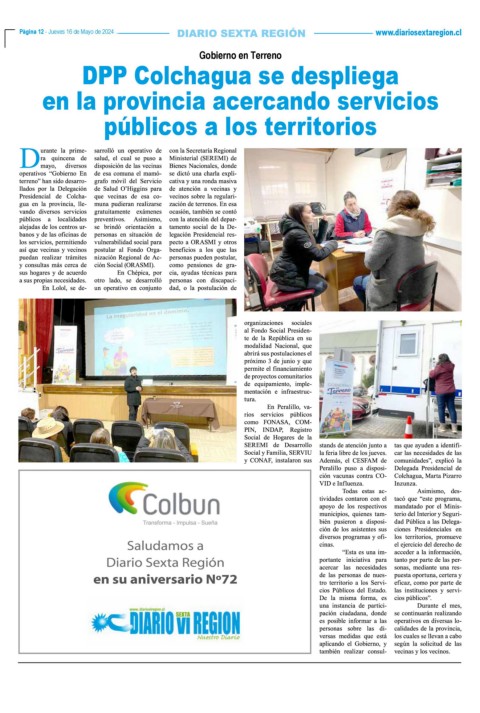 Página 12 - Jueves 16 de Mayo de 2024 www.diariosextaregion.cl Página 12 - Jueves 16 de Mayo de 2024 Gobierno en Terreno DPP Colchagua se despliega en la provincia acercando servicios públicos a los territorios
