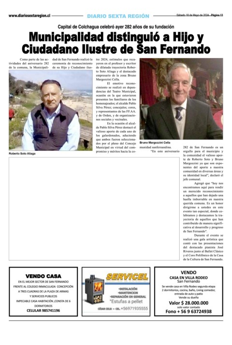 Municipalidad distinguió a Hijo y Ciudadano Ilustre de San Fernando Bruno Margozzini Cella Roberto Soto Aliaga VENDO CASA