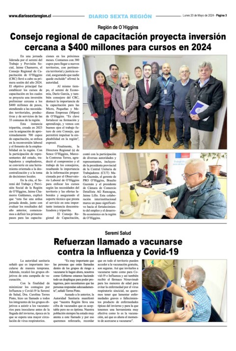 Lunes 20 de Mayo de 2024 - Página 3 Región de O´Higgins Consejo regional de capacitación proyecta inversión cercana a $400 millones para cursos en 2024 Seremi Salud Refuerzan llamado a vacunarse contra la Influenza y Covid-19
