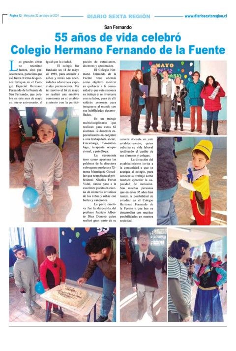 Página 12 - Miércoles 22 de Mayo de 2024 www.diariosextaregion.cl Página 12 - Miércoles 22 de Mayo de 2024 San Fernando 55 años de vida celebró Colegio Hermano Fernando de la Fuente