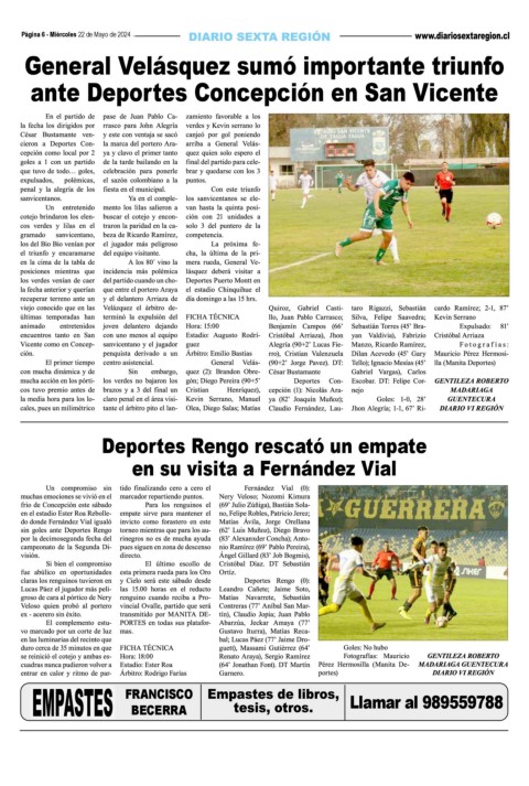 Página 6 - Miércoles 22 de Mayo de 2024 General Velásquez sumó importante triunfo ante Deportes Concepción en San Vicente Deportes Rengo rescató un empate en su visita a Fernández Vial FRANCISCO Llamar al 989559788 BECERRA