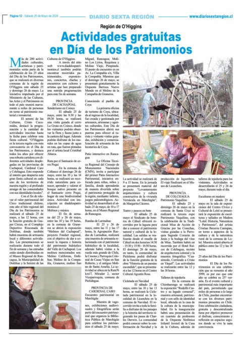Página 12 - Sábado 25 de Mayo de 2024 www.diariosextaregion.cl Página 12 - Sábado 25 de Mayo de 2024 Región de O’Higgins Actividades gratuitas en Día de los Patrimonios MUESTRA