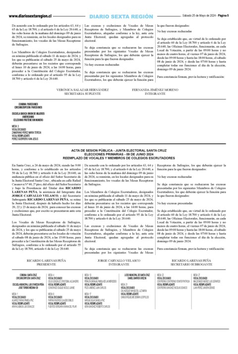 En Santa Cruz, a 24 de mayo de 2024, siendo las 9:00 De acuerdo con lo ordenado por los artículos 63, 64 y Receptoras de Sufragios, los que deberán ejercer la