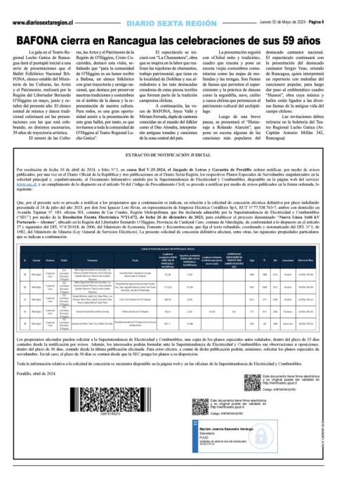 publicados, por una vez en el Diario Oficial de la República y tres publicaciones en el Diario Sexta Región, los respectivos Planos Especiales de Servidumbre singularizados en la