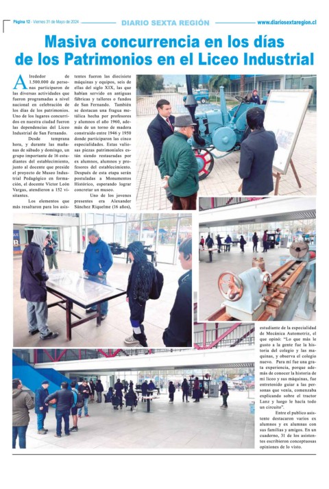 Página 12 - Viernes 31 de Mayo de 2024 www.diariosextaregion.cl Página 12 - Viernes 31 de Mayo de 2024 Masiva concurrencia en los días de los Patrimonios en el Liceo Industrial