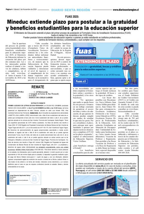 antecedentes en la causa. caso en que se requiera contactarlo durante la subasta. Bases y demás de viajes disponible en www.efe.cl. En caso de dudas o consultas, estas