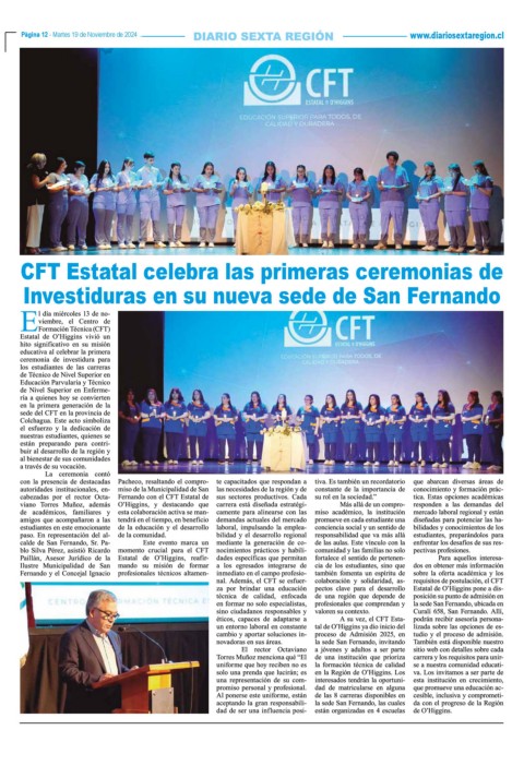 Página 12 - Martes 19 de Noviembre de 2024 www.diariosextaregion.cl Página 12 - Martes 19 de Noviembre de 2024 CFT Estatal celebra las primeras ceremonias de Investiduras en su nueva sede de San Fernando
