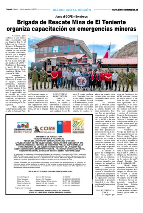 Página 8 - Martes 19 de Noviembre de 2024 Junto al GOPE y Bomberos Brigada de Rescate Mina de El Teniente organiza capacitación en emergencias mineras 241118601