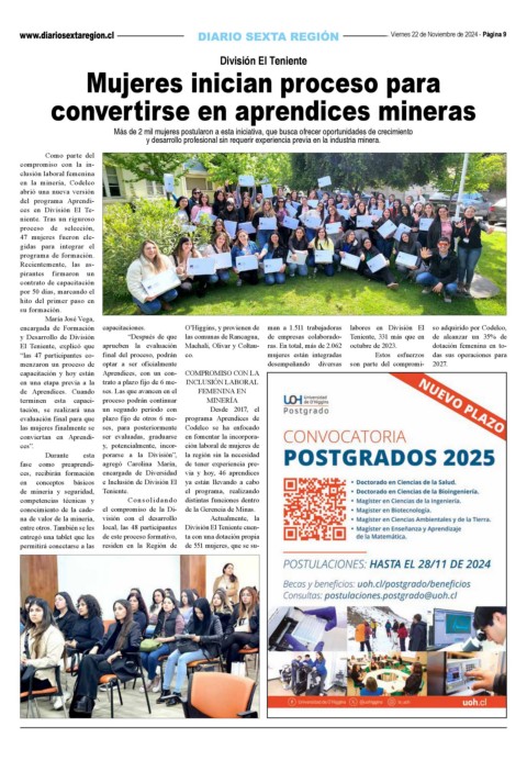 El Teniente, explicó que aprueben la evaluación Machalí, Olivar y Coltau- ras. En total, más de 2.062 octubre de 2023. dotación femenina en to-
